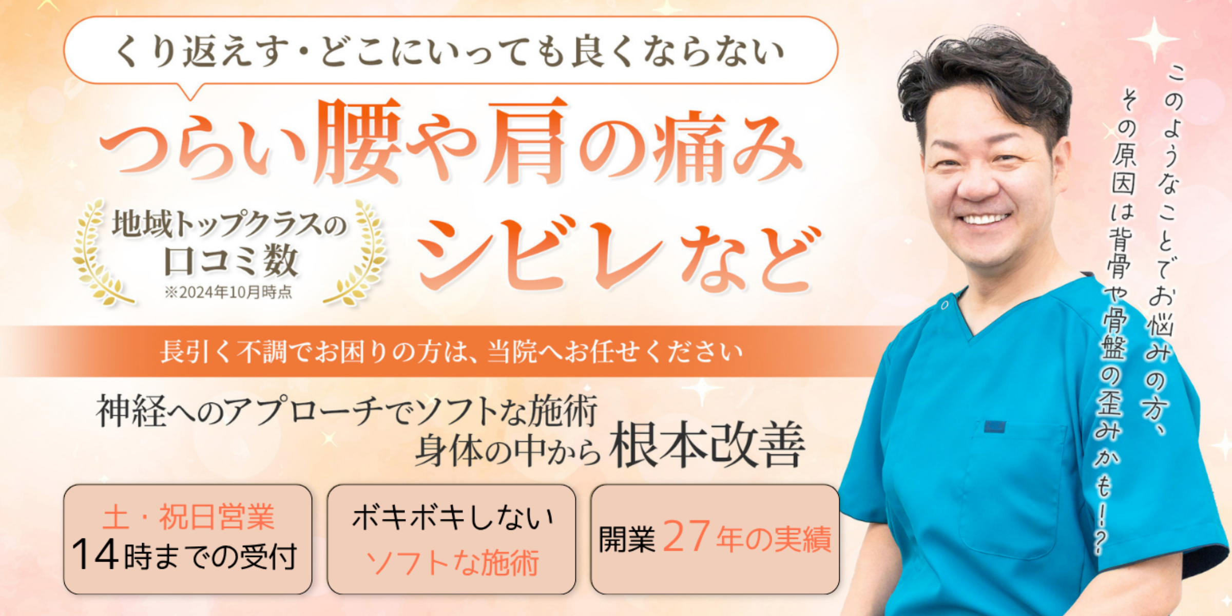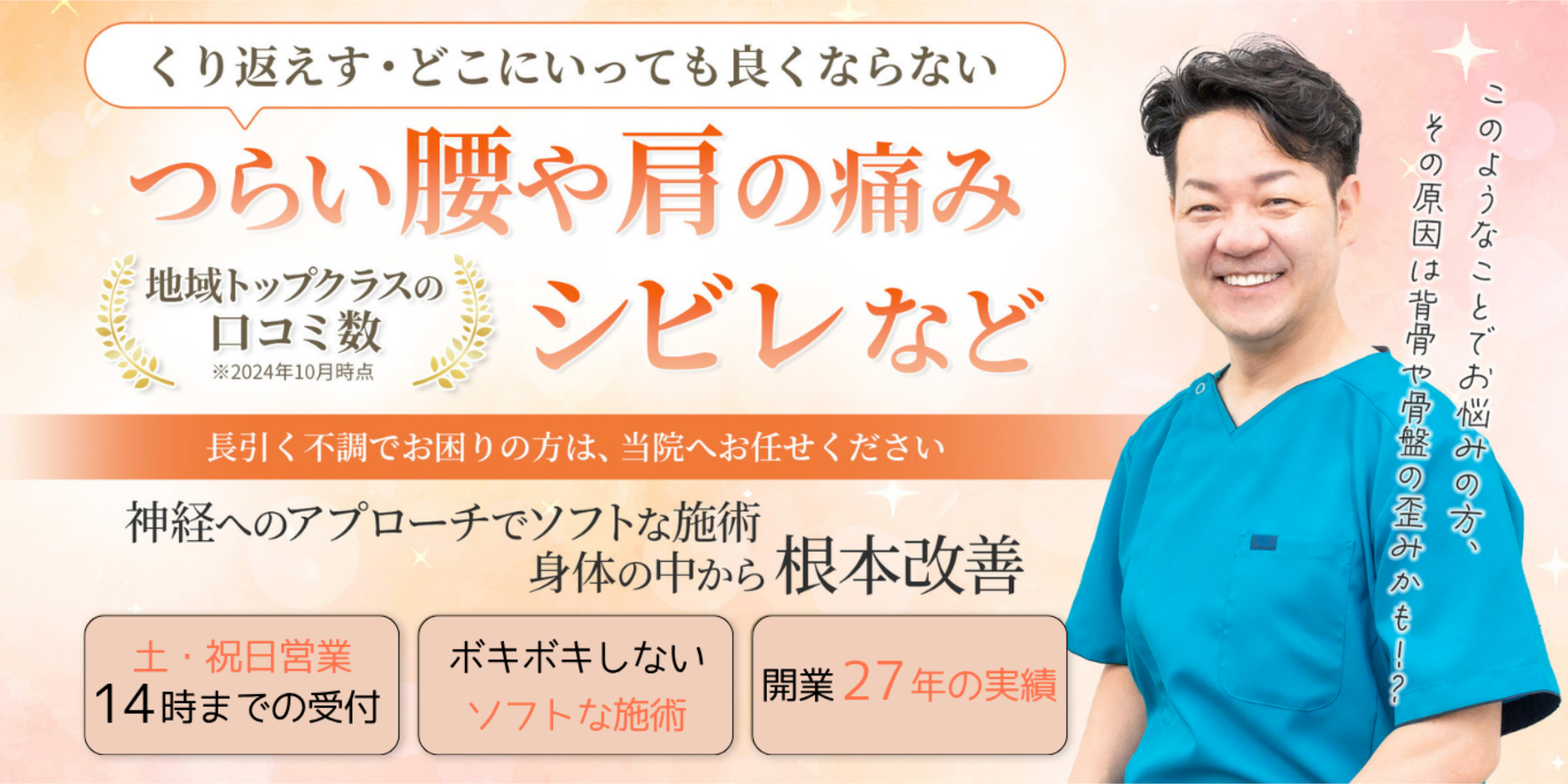肩こりや頭痛・腰痛やしびれといった症状のつらい所だけを、揉んだりほぐしたりしても一時的に楽になることはありますが、ほとんどのケースが根本的な改善までには至りません。
